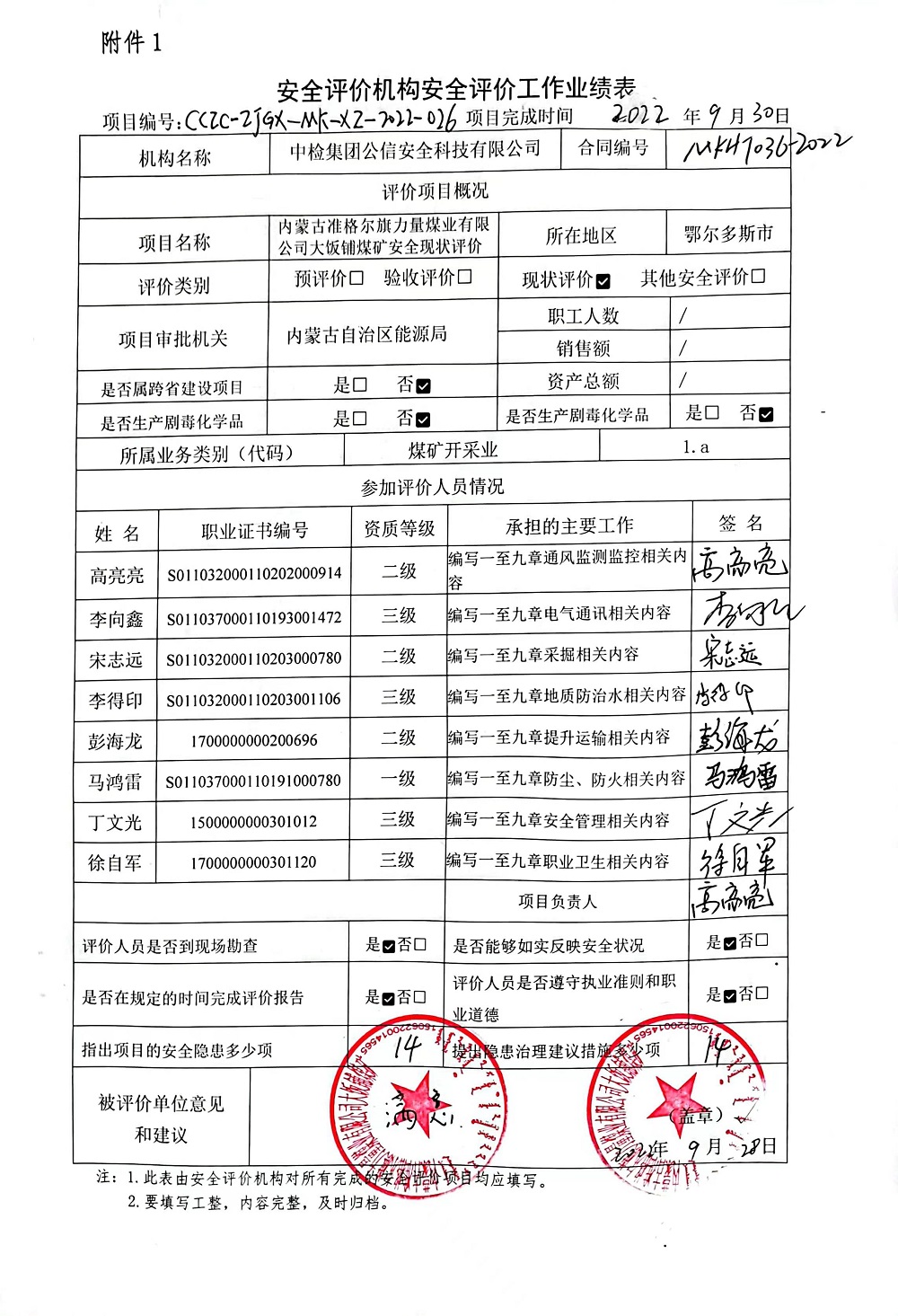 赴現(xiàn)場的評價師: 高亮亮、李得印、李向鑫、宋志遠(yuǎn)、徐自軍 | |||||||