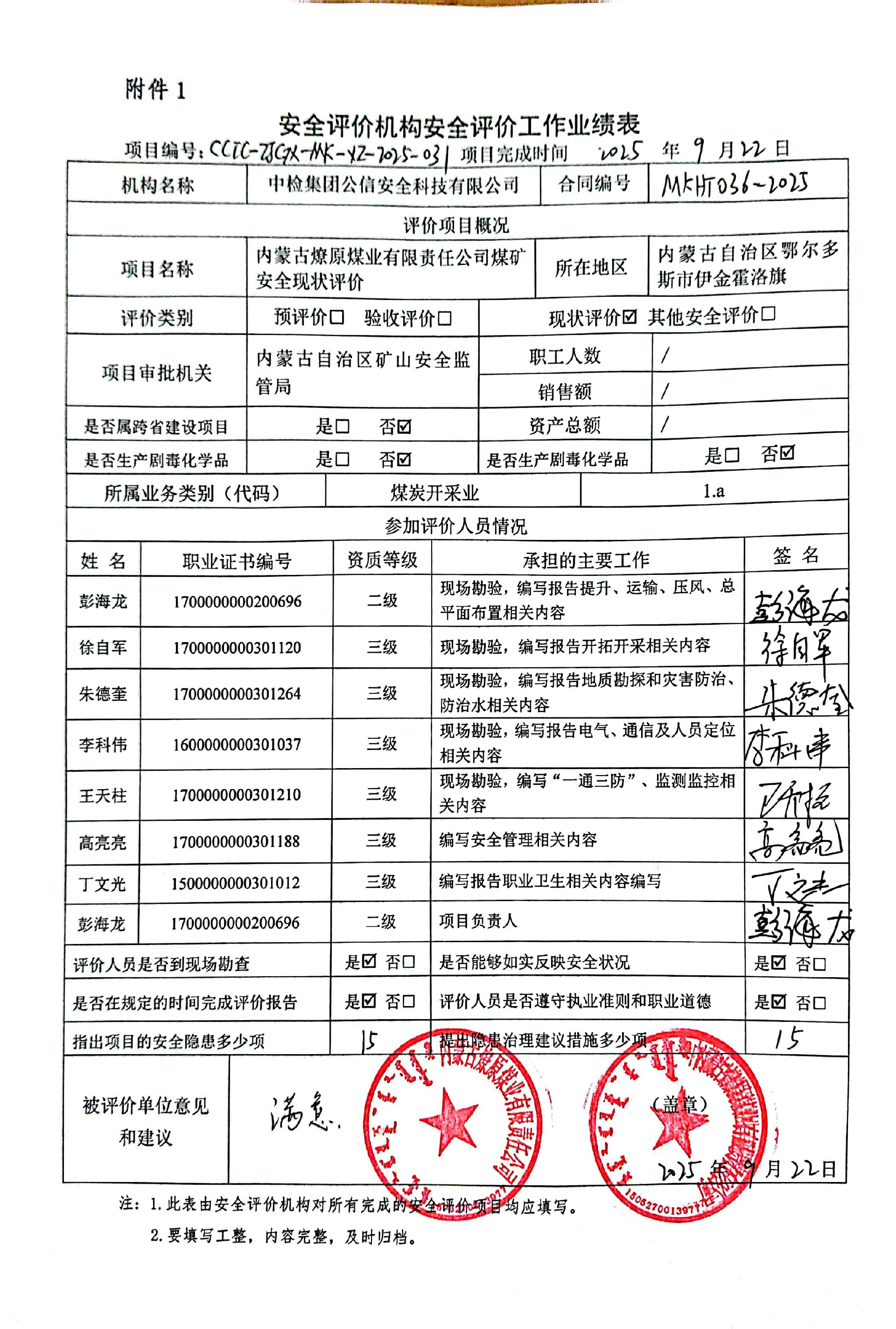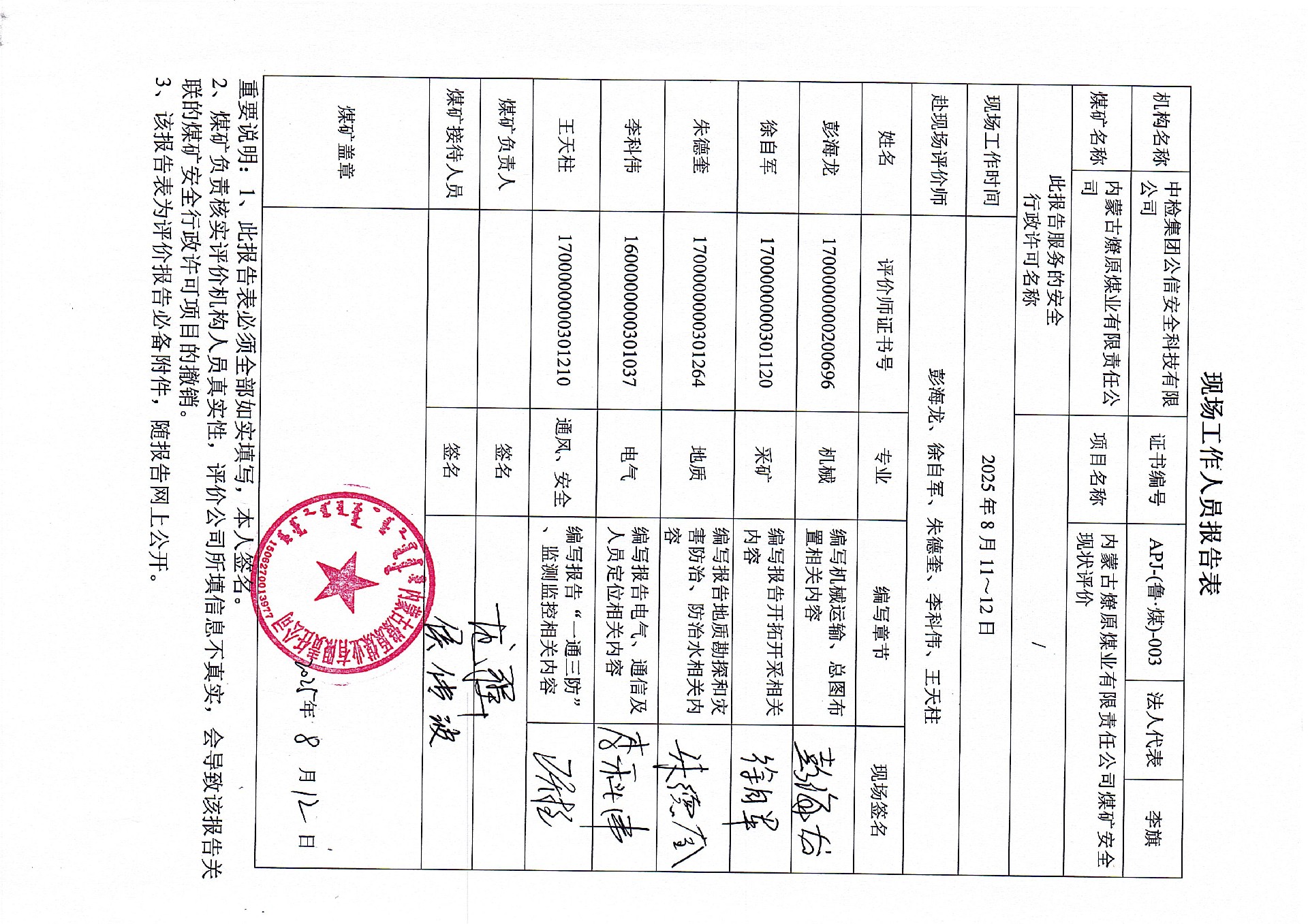 現(xiàn)場開展安全評價工作的人員、時間及主要任務(wù): 彭海龍、李科偉、徐自軍、朱德奎、王天柱于2025年8月11日~12日到現(xiàn)場進(jìn)行調(diào)查、搜集資料,進(jìn)行現(xiàn)場評價。于2025年8月17日到現(xiàn)場評價時存在的問題進(jìn)行了復(fù)查。 | |||||||