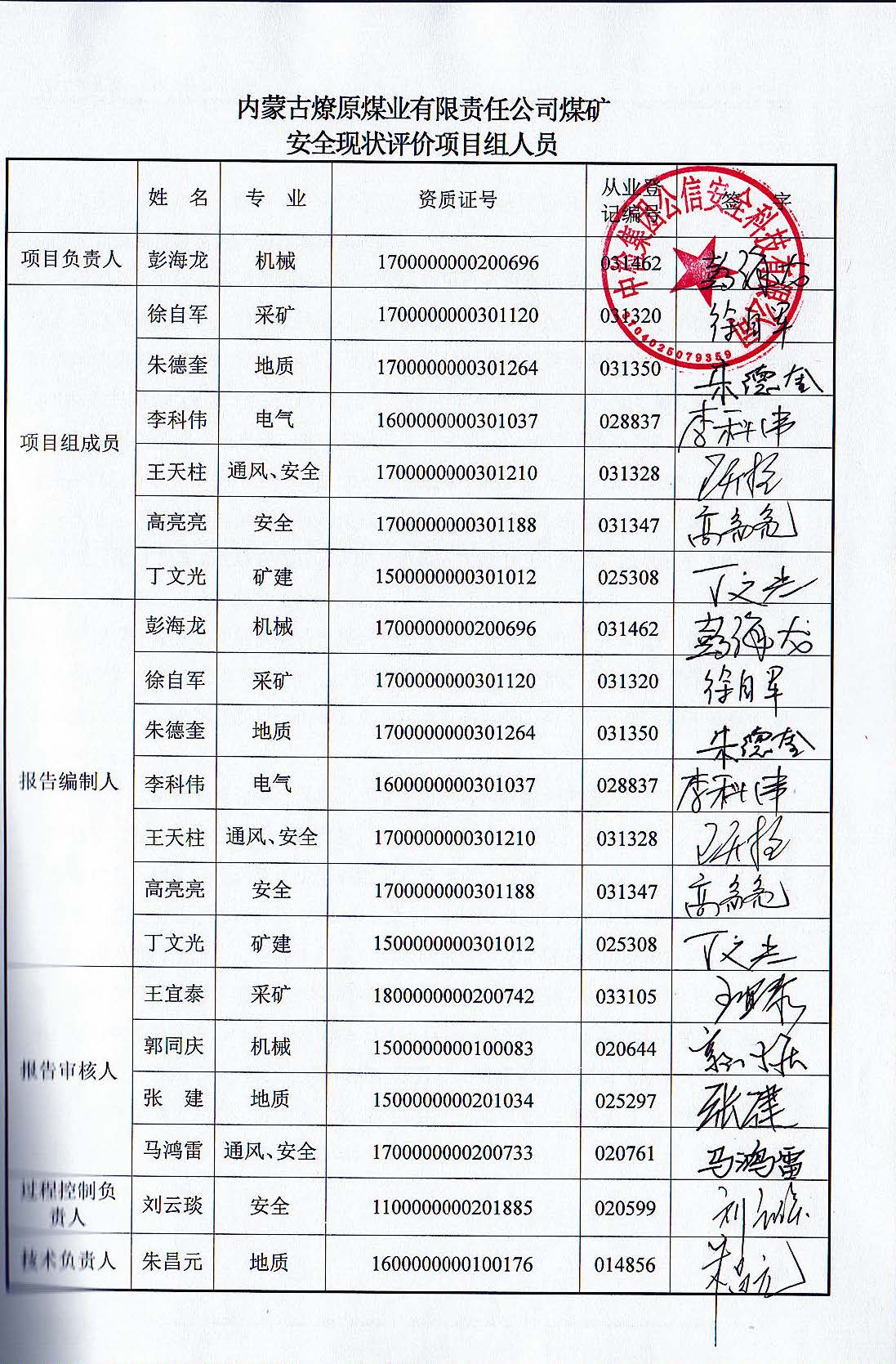 參與安全評價工作的安全評價師: 彭海龍 李科偉 徐自軍 朱德奎 王天柱 高亮亮 丁文光 | |||||||