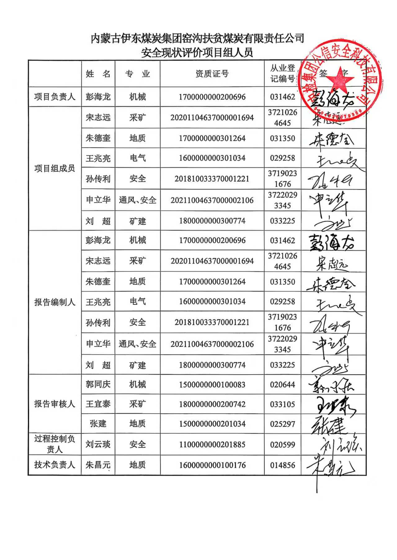參與安全評價(jià)工作的安全評價(jià)師: 彭海龍 孫傳利 申立華 朱德奎 宋志遠(yuǎn) 王兆亮 劉超 | |||||||