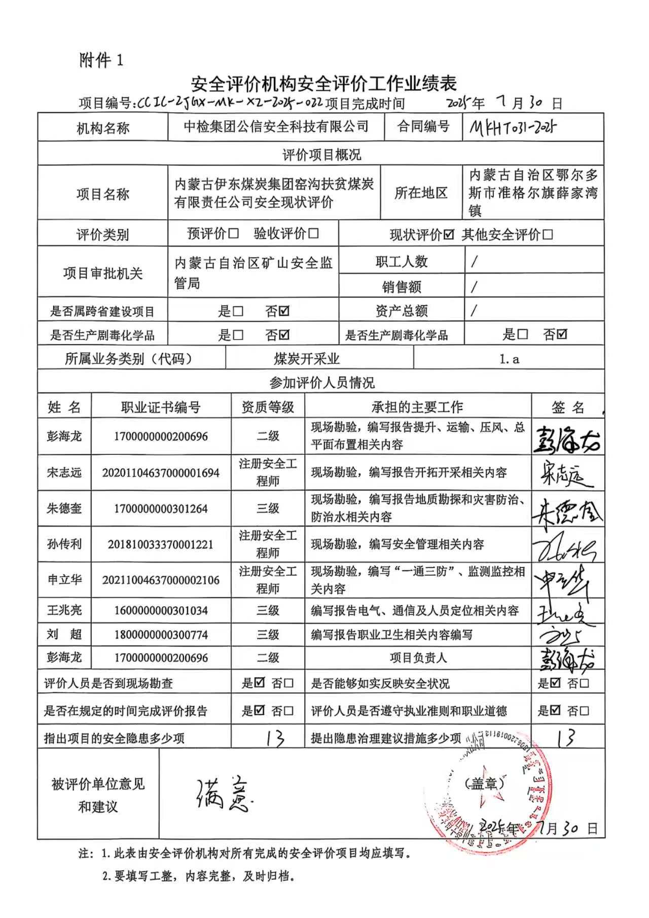 現(xiàn)場開展安全評價(jià)工作的人員、時(shí)間及主要任務(wù): 彭海龍 孫傳利 申立華 朱德奎 宋志遠(yuǎn)于2025年6月24日~25日到現(xiàn)場進(jìn)行調(diào)查、搜集資料,進(jìn)行現(xiàn)場評價(jià)。 彭海龍 申立華 朱德奎于2025年6月15~27日對現(xiàn)場問題進(jìn)行復(fù)查,礦方均已整改合格。 彭海龍 孫傳利 申立華 朱德奎 宋志遠(yuǎn) 王兆亮 劉超 對報(bào)告進(jìn)行了編寫。 | |||||||