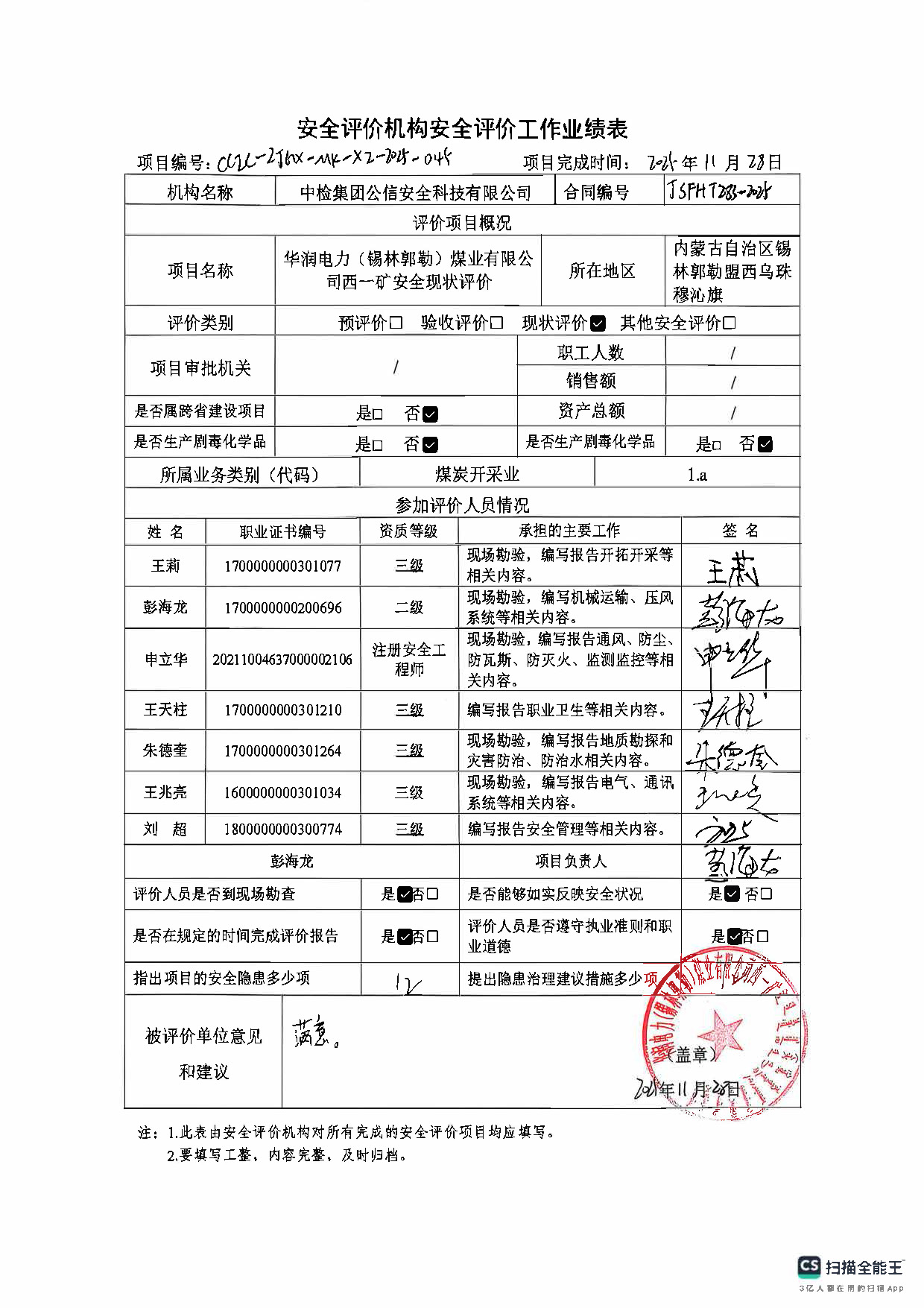 現(xiàn)場開展安全評價工作的人員、時間及主要任務: 彭海龍 申立華 朱德奎 王莉 王兆亮于2025年10月27~28日到現(xiàn)場進行調查、搜集資料,進行現(xiàn)場評價。 彭海龍 朱德奎于2025年10月31日對現(xiàn)場問題進行復查,礦方均已整改合格。 彭海龍 王莉 申立華 王天柱 朱德奎 王兆亮 劉超對報告進行了編寫。 |