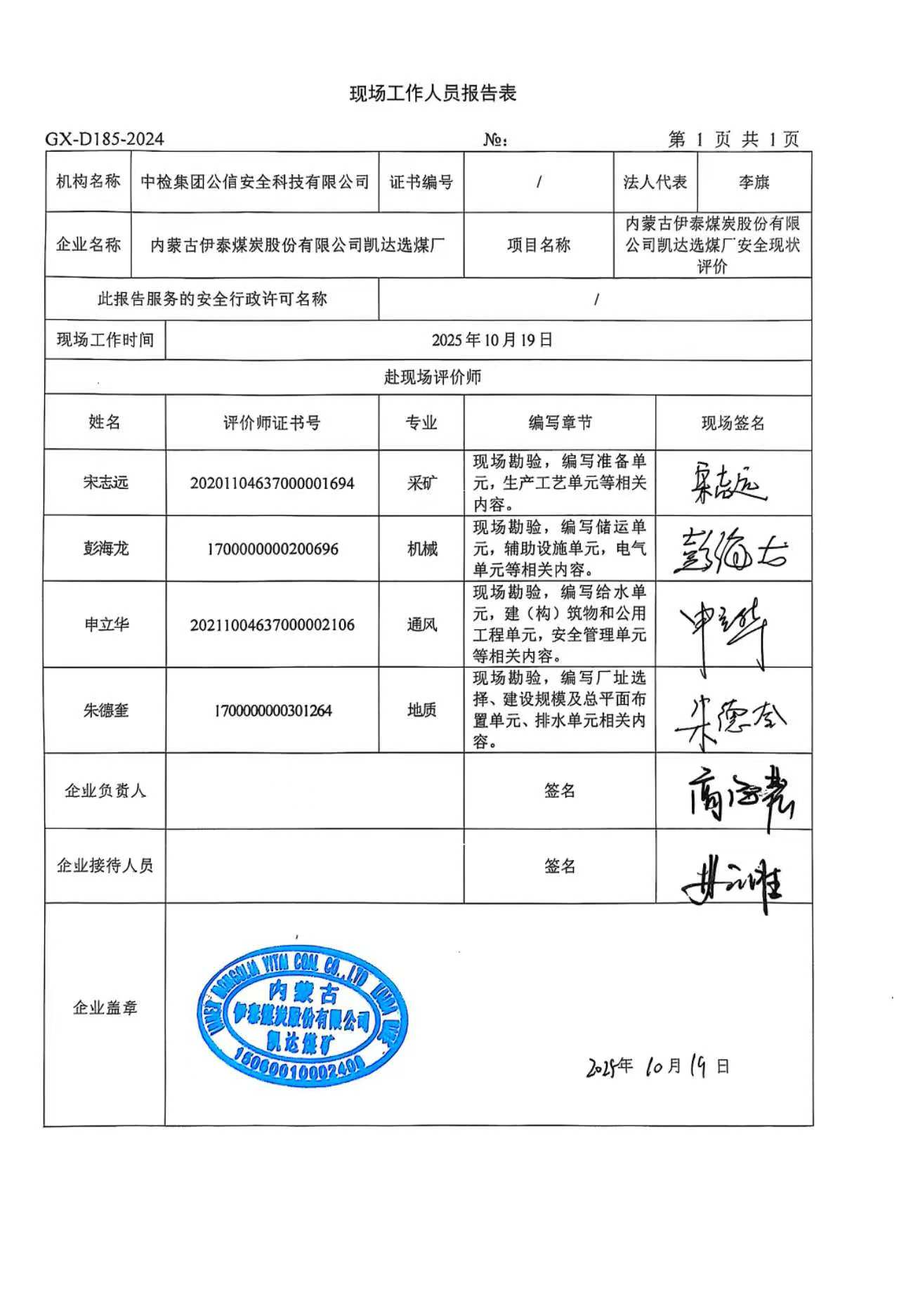 現(xiàn)場開展安全評價工作的人員、時間及主要任務(wù): 彭海龍 申立華 朱德奎 宋志遠(yuǎn) 于2025年10月19日到現(xiàn)場進(jìn)行調(diào)查、搜集資料,進(jìn)行現(xiàn)場評價。 彭海龍 宋志遠(yuǎn) 于2025年10月21日對現(xiàn)場問題進(jìn)行復(fù)查,礦方均已整改合格。 彭海龍 申立華 朱德奎 宋志遠(yuǎn) 對報告進(jìn)行了編寫。 | |||||||