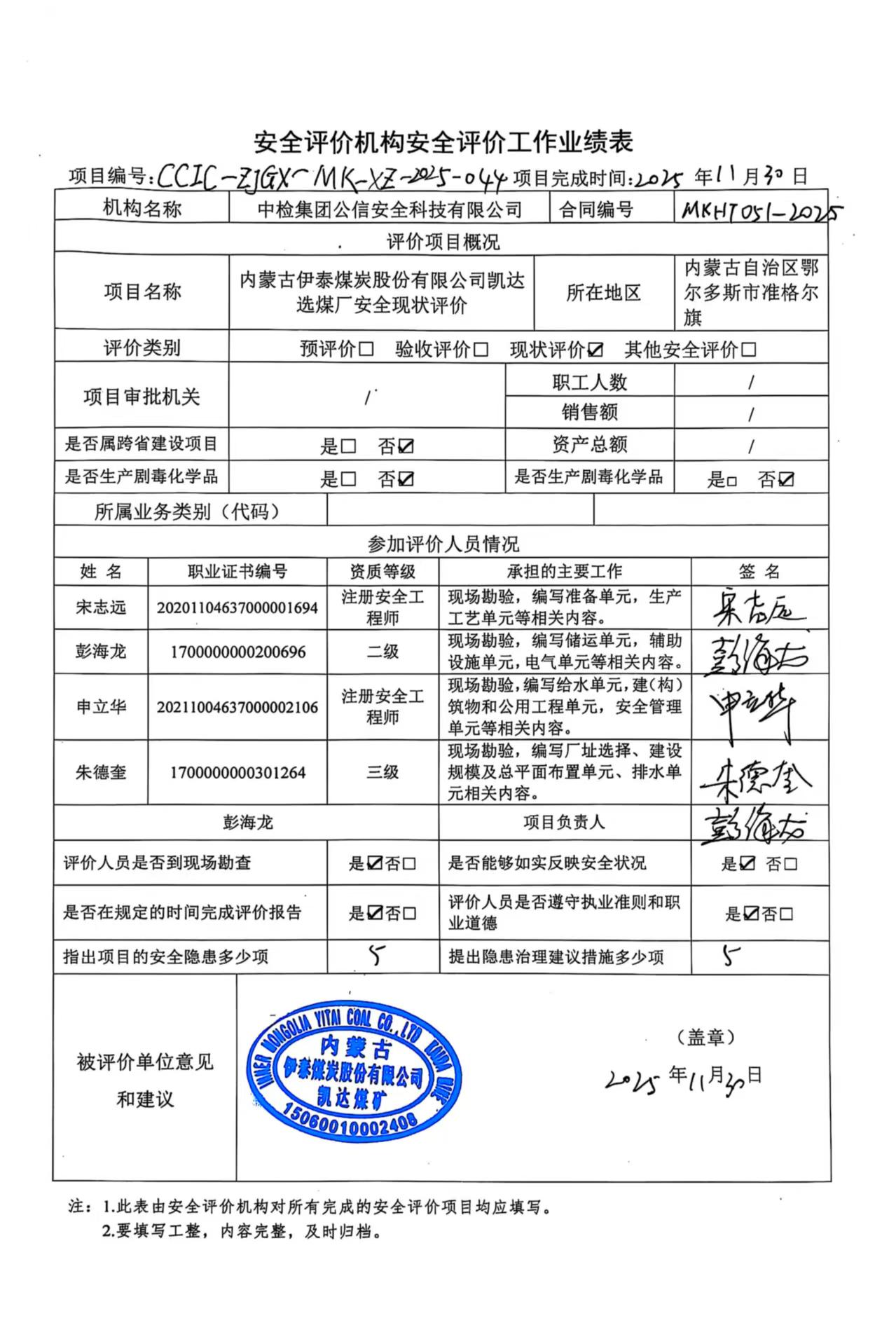 評價項目名稱 | 內(nèi)蒙古伊泰煤炭股份有限公司凱達(dá)選煤廠安全現(xiàn)狀評價報告 | ||||||