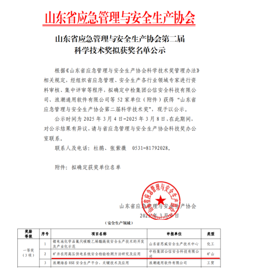 喜訊!中檢公信科技成果榮獲山東省應(yīng)急管理 與安全生產(chǎn)協(xié)會“科學(xué)技術(shù)獎一等獎”