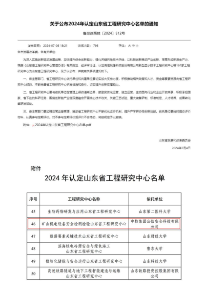 2024年7月4日,山東省發(fā)展和改革委員會(huì)公布了2024年認(rèn)定山東省工程研究中心名單的通知,依托中檢集團(tuán)公信安全科技有限公司申報(bào)的“礦山機(jī)電安全檢測(cè)檢驗(yàn)山東省工程研究中心”位列其中。山東省工···