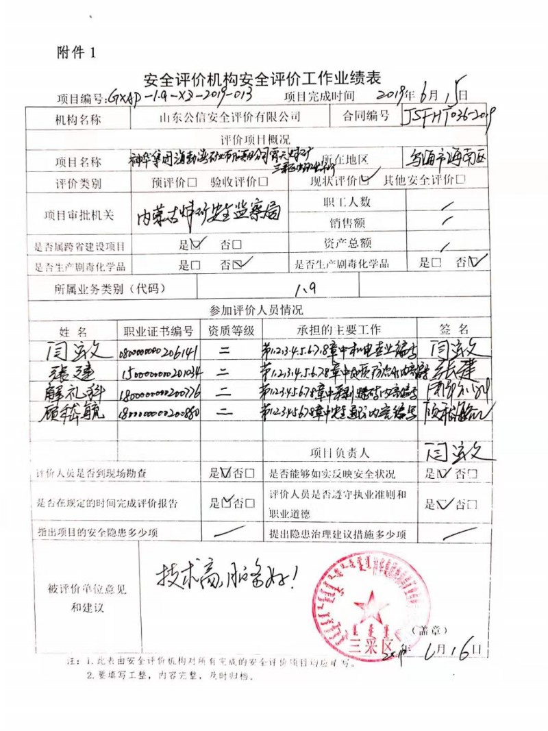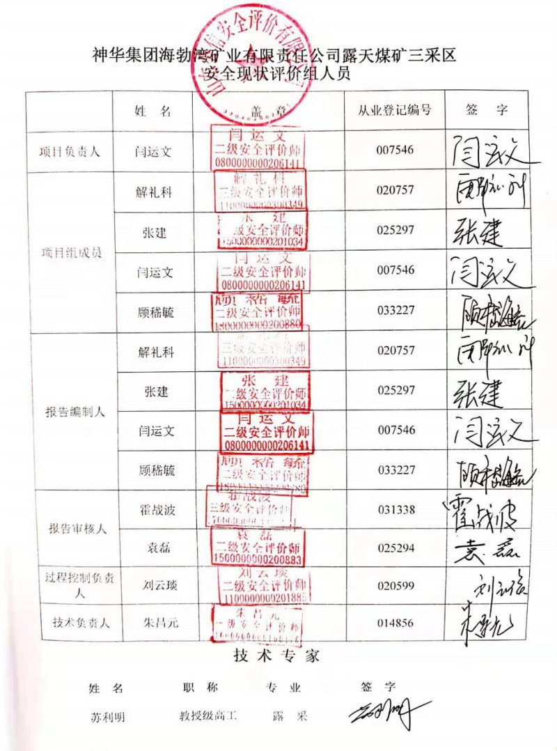 | 參與安全評價工作的安全評價師: 閆運文、張建、解禮科、顧嵇毓 |