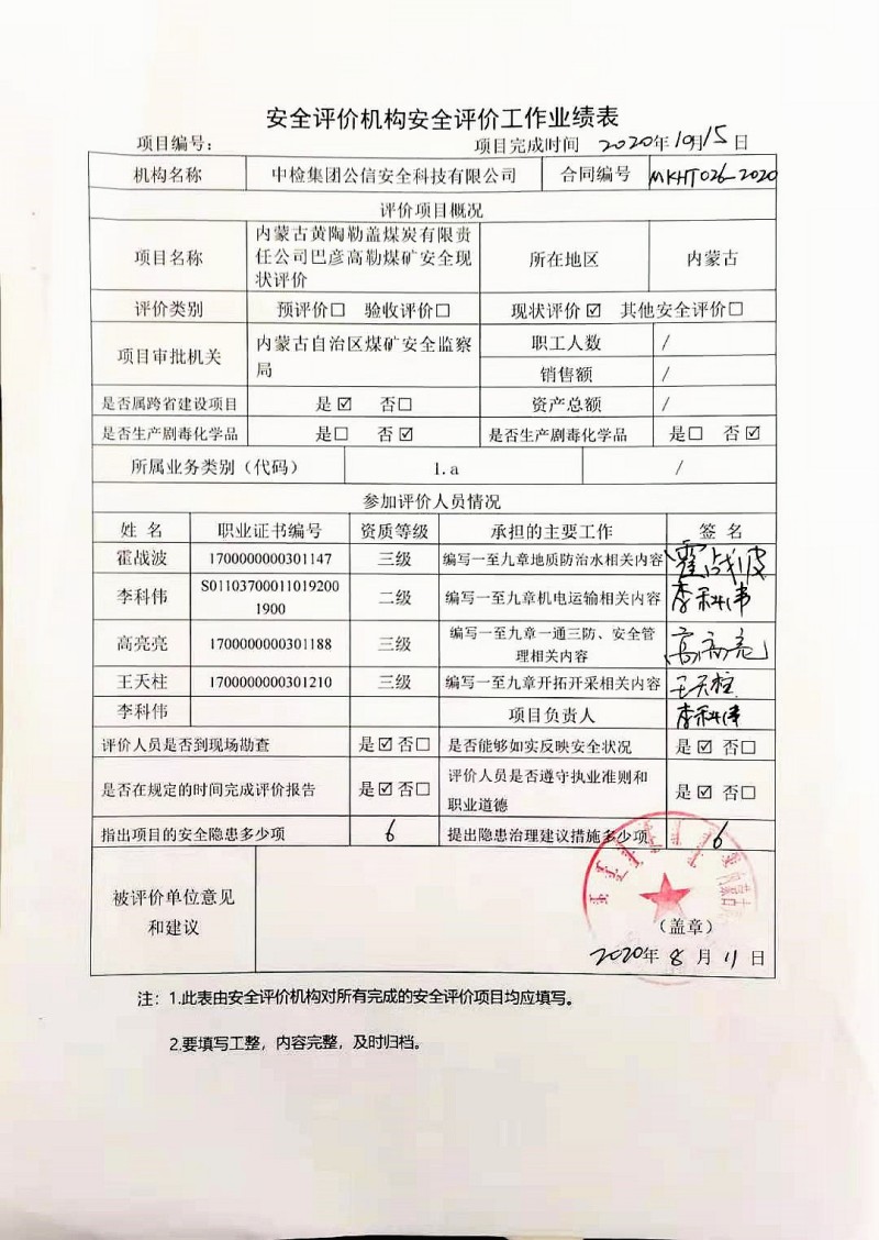 | 到現(xiàn)場開展安全評(píng)價(jià)工作的人員、時(shí)間及主要任務(wù): 人員:李科偉、王天柱、高亮亮、霍戰(zhàn)波 時(shí)間、任務(wù): 2020年8月10~11日現(xiàn)場調(diào)查;2020年9月25日復(fù)查;2020年9月26日至2020年10月15日編寫修改完善報(bào)告。 |