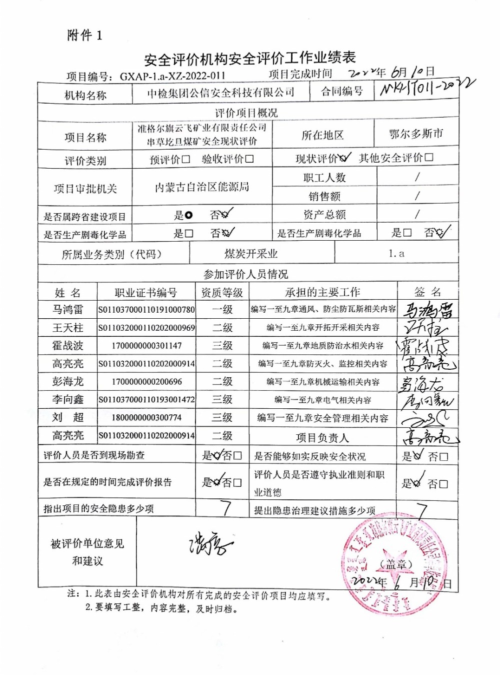 | 評價項目名稱 | 準格爾旗云飛礦業(yè)有限責任公司串草圪旦煤礦安全現(xiàn)狀評價 | ||||||
