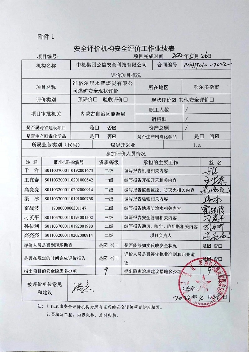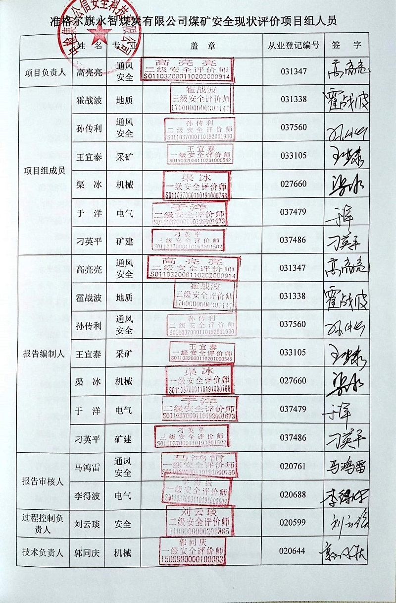 | 評價項目名稱 | 準格爾旗永智煤炭有限公司煤礦安全現(xiàn)狀評價報告 | ||||||